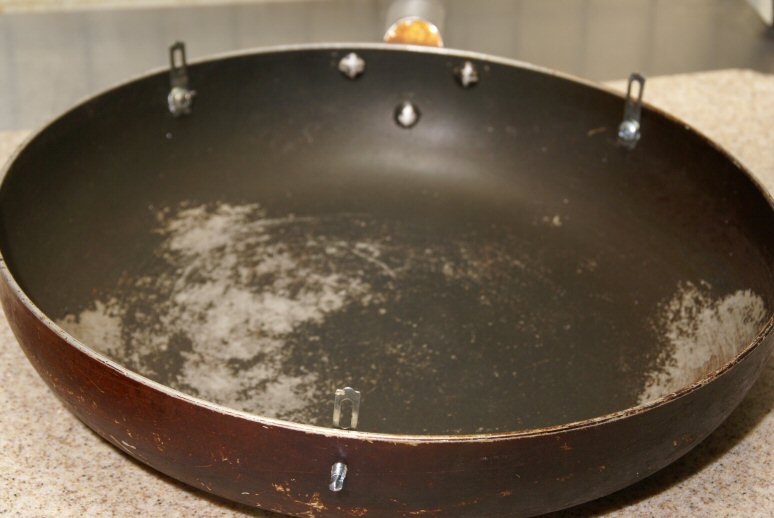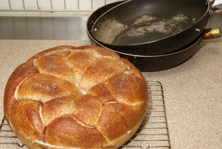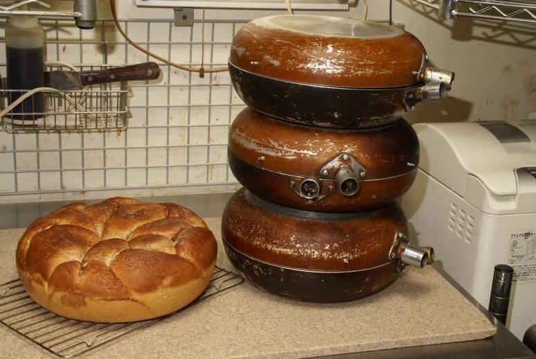 A venit timpul să schimb tigăile. Pe cele vechi, deşi jupuite, cu mînerele slăbite, parcă nu-mi venea să le arunc. Şi atunci, mi-a venit o idee. Să le folosesc drept forme de cozonac. Zis şi făcut. Le deşurubai mînerele şi gata formele. Hai, să le vedem la lucru. Ce capac înalt să le fac? Cel mai simplu a fost să le fac tot din tigăi. Din şase tigăi, la trei am ataşat cîte trei urechi de tablă, fixate cu şuruburi autofiletante. (v. pozele) Improvizai apoi un aluat de cozonac, pe care îl frămîntai într-o maşinărie de pîine, pe post de malaxor.