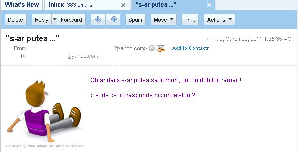 Am primit şi un mesaj din partea unei persoane destul de bisericoase altminteri. Alta decît comentatorii de mai jos. Din pudoare, am anonimizat expeditorul: