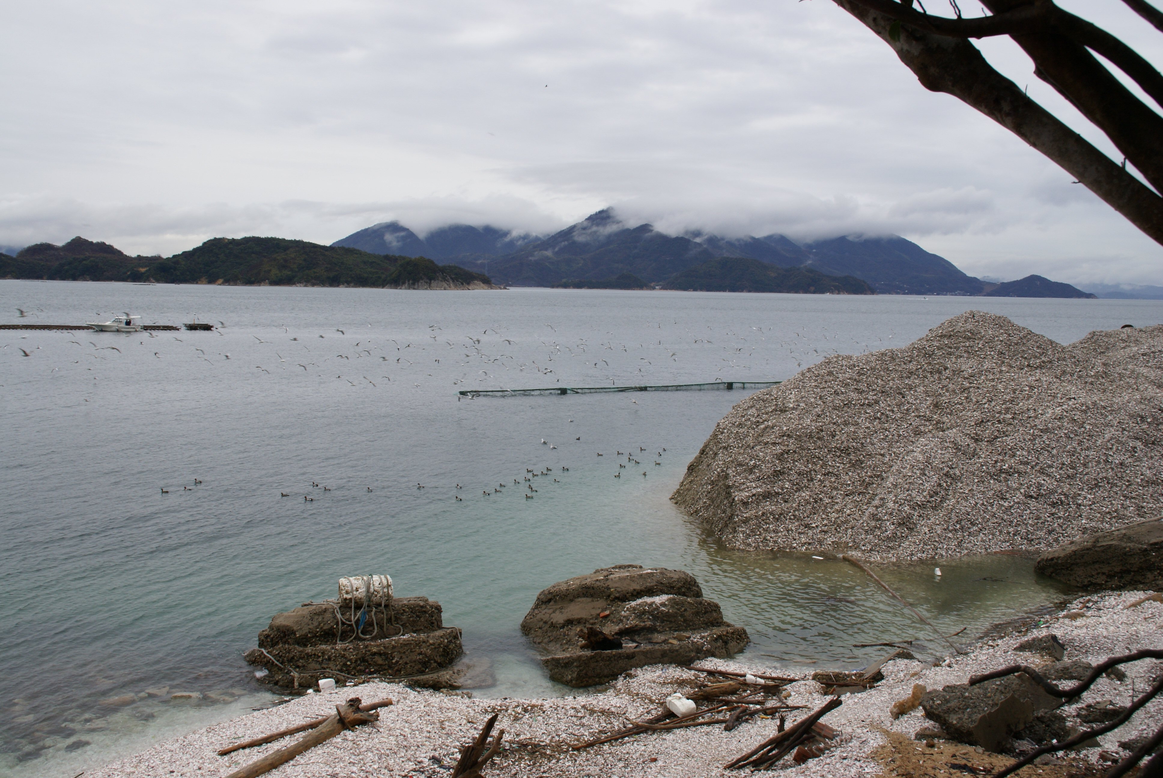 Carapacele de scalop se înşiră pe sîrme cufundate în mare de pe plute de bambus. Ele servesc ca substrat pentru dezvoltarea stridiilor. La recoltare se trag şiragurile în barcă. Un ciclu de cultură durează în medie doi ani. O mare parte din „scoicicultura” de stridii (de pulpă, nu de perle) se face în Golful Hiroshima.