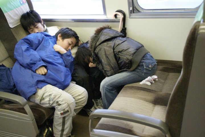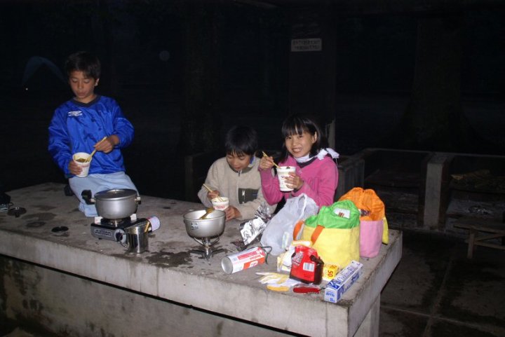 La cină: instant raamen şi curry-rice. Curry din pungă, iar orezul, fiert la faţa locului. Nu am avut farfurii. Uitaserăm acasă şi lingurile. Copiii au fost nevoiţi să mănînce curry cu beţe, după ce goliseră de raamen paharele de carton. Locul de gătit e un şopron de beton unde se poate face şi foc de lemne. Utilajul: 10 vetre şi două jgheaburi lungi de beton, ultimele folosite şi ca spălătoare. Lumina are senzor de prezenţă şi stă aprinsă atît cît e nevoie. La fel e şi la toalete.