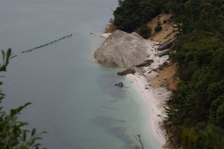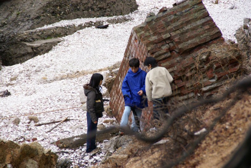 Ne apropiem. Cele două blocuri de beton din planul apropiat sunt două afete de tun din era Meiji, demult căzute din turnurile de pe faleză. (Fotografia de mai jos poate fi mărită cu un clic.)