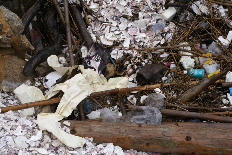 O puştioacă rămasă cu labia desumflată, aruncată de valuri, zăcea printre gunoaie.