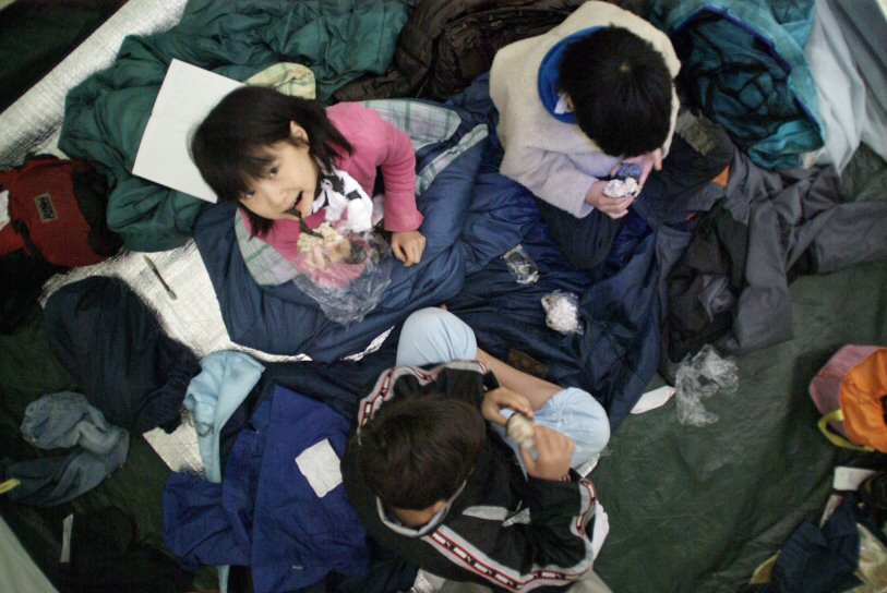 Copiii, mîncau onigiri cu nori în deplina dezordine din cort.