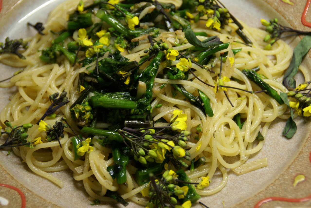 Sunt flori de rapiţă. Rapiţa e rudă bună cu varza. Inflorescenţele, în special cele în stadiu de conopide se pot mînca. Dar chiar şi după inflorire, dacă sunt destul de fragede. Soiul din fotografie nu este nici amărui. Gustul l-am dat cu nan pla (un fel de sos de peşte fermentat*) iar aroma cu usturoi călit în ulei.