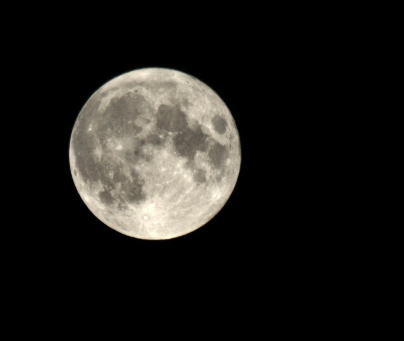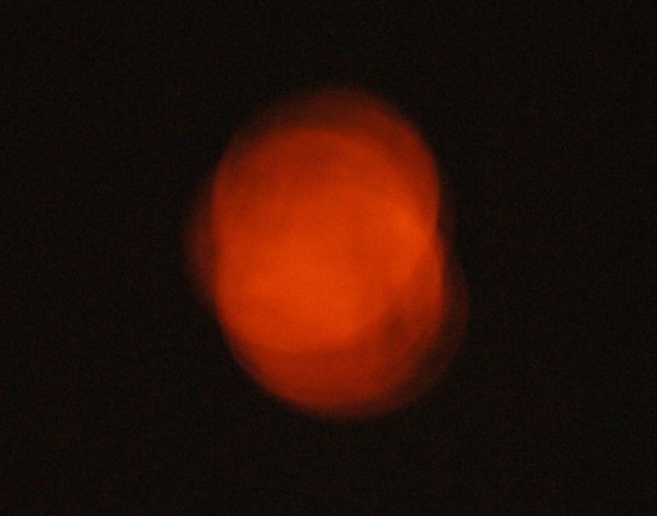 Fotografia de mai jos reprezintă tot Luna, dar fotografiată cu o zi înainte, la apus. Ieri am descoperit prea tîrziu că s-a înseninat cerul. Pe la ora 3:46 am înşfăcat aparatul, am alergat după ea, dar nu am avut timp decît să încerc în disperare să o pozez din mînă, pînă nu dispare după acoperişuri. Nu e greu de intuit că Luna la apus nu are aceeaşi luminozitate ca la zenit. Deşi setasem la ISO 1600 timpul necesar de expunere era cam de 1 secundă. Iată ce a ieşit:
