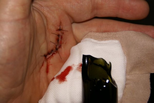 Mă opintesc, şi mă opintesc… şi mă opintesc… Nimic. Strîng de tirbuşon şi trag cu toată puterea, afişînd un zîmbet culturist de scenă (deh! eram în faţa muierii). Deodată, la limita luxaţiei de umăr, reuşesc să scot dopul. Cu tot cu o parte din gîtul sticlei. În mîna stîngă strîng din reflex restul de gît încă solidar cu sticla. Mă trezesc cu o tăietură adîncă chiar în podul palmei. „Am învaginat-o!”, îmi zic. N-o să mai pot modela pîinea, spăla vase, ţine tigaia. Tetsu se uită speriat, ca la katsuo no tataki*. Nevastă-mea intră în panică. Sare la pupitru şi încearcă să caute pe net un spital cu serviciu de urgenţă. Apăs imediat rana cu degetul mare şi mă întind pe o bancă din restaurant, aşteptînd să se coaguleze sîngele. Cele două cliente din acel moment se lămuresc repede despre ce e vorba. Pînă să afle nevastă-mea spitalul proxim, una dintre ele sună pompierii. Zice apoi: -„Chiar dacă mergeţi la urgenţă, spitalul are urgenţe şi urgenţe. Cu salvarea aveţi prioritate.”