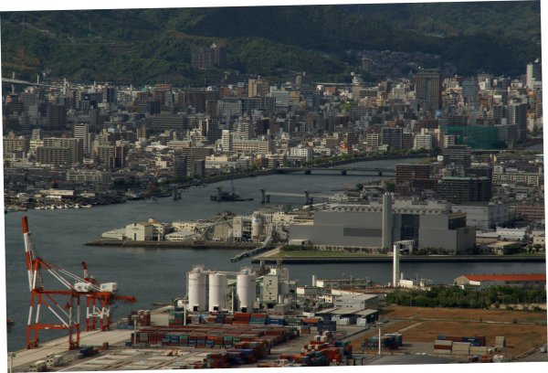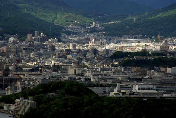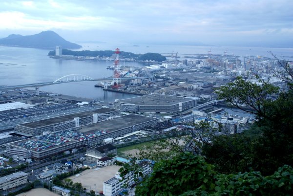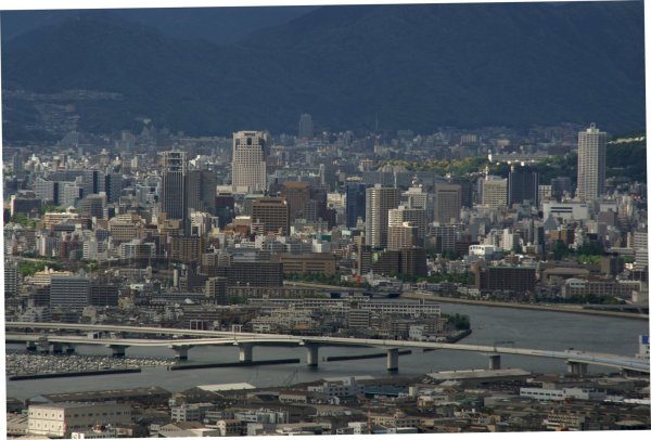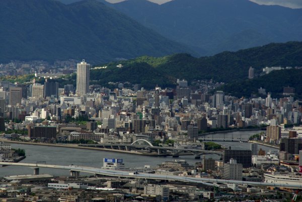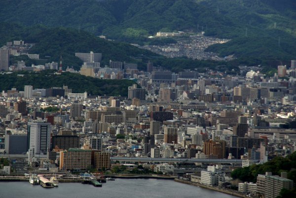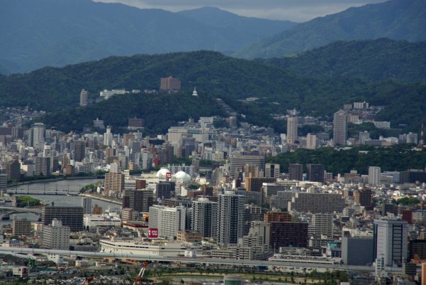 ↑ Zona de est a Hiroşimei. Se vede în prim plan portul Ujina. Zona înverzită din planul secund este restul muncelului Hijiyama. Mai departe, pe coasta muntelui, o parte din cartierul Ushita. În centrul fotografiei, (mai mult în jumătatea dreaptă) se poate vedea acoperişul unei arene de baseball, construită recent, pe terenul achiziţionat de la compania feroviară JR. Arena veche, din vecinătatea Domului Atomic, construită în anii 50 din subscripţie publică, este în curs de demolare. Proprietatea asupra terenului eliberat rămîne în litigiu. Cu atît mai încleştat, cu cît preţul unitar este acelaşi cu al celui de sub hotelul de lux.
