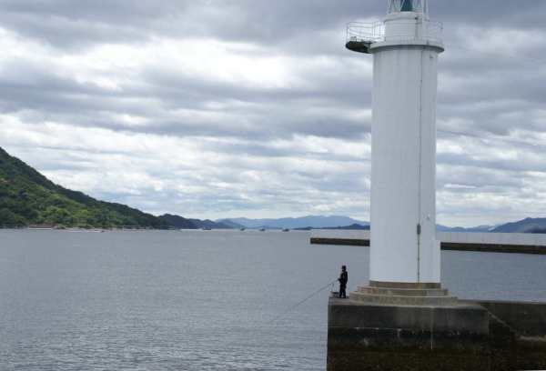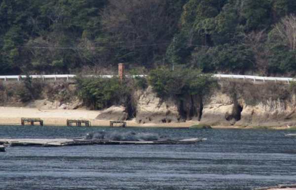 Vedere către est. Insula Taoshima (Toogeshima?) În fundal, se poate vedea vîrful Egezan (cca. 600m) dintre tîrgurile Yano şi Saka, din plasa Aki. În planul apropiat, culturi flotante de stridii.