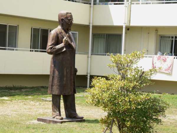 Trecem pe lîngă un cămin, probabil pentru personalul didactic al gimnaziului din vecinătate. Ne atrage privirea o statuie de bronz, uşor disproporţionată, înfăţişîndu-l pe Karl Juchheim, un fost prizonier neamţ. În primul război mondial, nu ştiu prin ce împrejurări, un grup de prizonieri au fost internaţi într-un mic lagăr pe insula Ninoshima.
