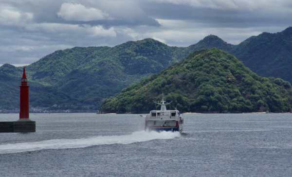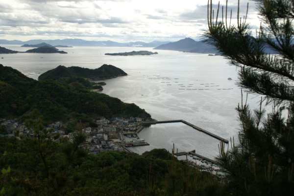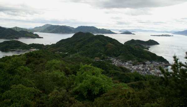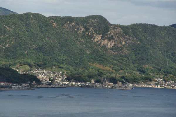 Vedere către sud. Se poate vedea aşezarea de la port, precum şi cele două promontorii de la extremitatea sudică. În planul terţ, insula Etajima, considerabil mai mare, mai dendritică şi mai populată.