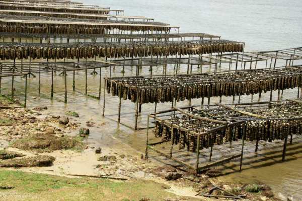 Ajungem într-un mic golf. Mareea este joasă, ceea ce ne permite să observăm agregatele de stridii în cultură rezemată.