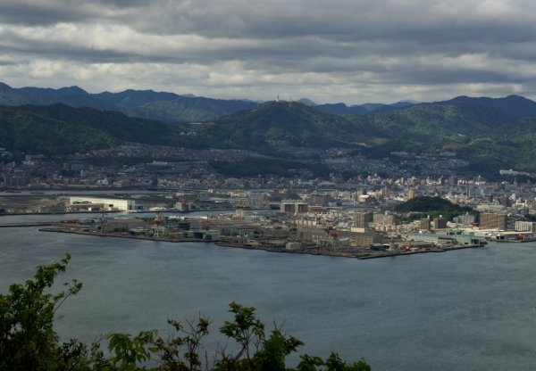 Suntem în vîrful Aki-no-kofuji (278m). Facem un tur parţial de orizont, deoarece, spre vest, un copac ascunde priveliştea. Mai strică clişeul şi o linie electrică aeriană ce alimentează baliza terestră pentru traficul aerian. (În apropiere e vechiul aeroport din Hiroşima).