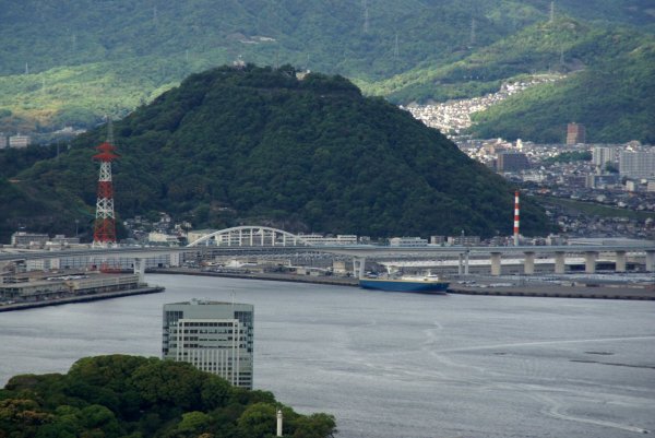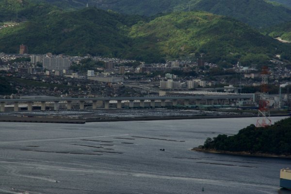 În planul proxim se poate vedea terminalul de containere de pe grindul Ujina-Niho. În planul secund, pe grindul Yoshijima, o fabrică de ciment. Imediat în spatele ei, două antrepozite frigorifice. Pe braţ, mai în aval de pod, sunt pilonii noii căi ocolitoare a DN2. Cînd va fi gata, traficul de pe actualul DN2 e de aşteptat să scadă.