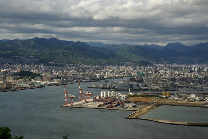 Un mic terminal de containere, alături de o a doua viitoare parcelă de uscat. Se poate vedea clar şi unul din braţele rîului Otagawa.