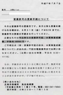 Dacă veţi continua activitatea fără să reînoiţi autorizaţia în termenul indicat, în temeiul articolului 72 al Legii igienei în alimentaţie, sunteţi pasibil de închisoare de pînă la 2 ani, sau de amendă de pînă la 2 milioane yen, pentru comerţ neautorizat.