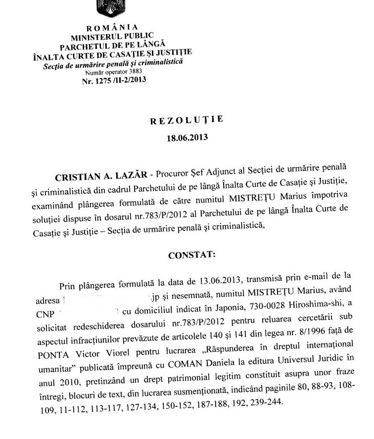 La rîndul meu, văzînd omerta generală, printr-un raţionament juridic ce nu poate fi contestat de către niciun jurist cu oarece cunoştinţe de drept, am demonstrat că NUP-ul Parchetului deschide o cutie a Pandorei. Parchetul s-a mulţumit să mă expedieze cu un sofism. (pag.1) şi (Pag.2) L-a durut fix în cur de „interesele generale ale societăţii”.