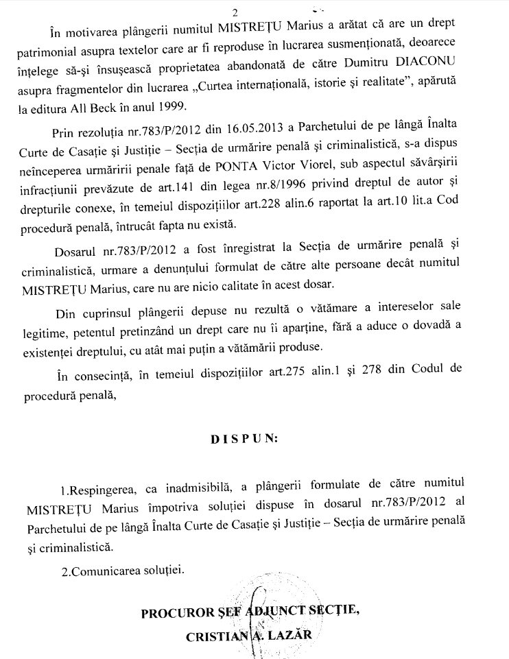În cazul lucrării comerciale în discuţie, amicii noştri procurori nu par a fi înţeles că lipsa acţiunilor preventive pe care legalmente le aveau în fişa postului, lezează morala publică, adică tocmai „interesul general al societăţii”. Pilda lor lasă o breşă imensă în interesul public. Breşă prin care oprobriul nostru se va revărsa nu numai asupra ticălosului premier şi a obtuzilor procurori, dar şi asupra autorilor-sursă şi a editurilor părtaşe la frauda intelectuală prin inacţiunea lor.