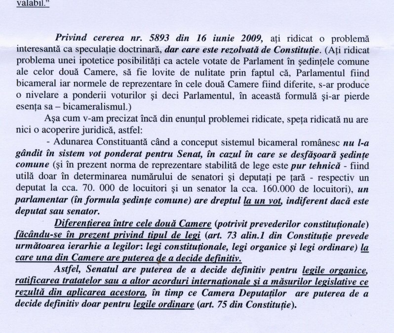 În opinia mea, prevederile constituţionale pomenite mai sus sunt în conflict. De ce? Pentru că, sintagma: „şedinţă comună” este în mod automat, şi necesar, asimilată conceptului de MONOCAMERAL. Cu alte cuvinte, România are un Parlament bicameral, pe pe ici pe colo, monocameral. Teama mea este că incoerenţa textului constituţional poate duce la lovirea de nulitate a tuturor deciziilor luate în şedinţă comună de Parlament. În opinia mea, conflictul trebuie neapărat tranşat la Curtea Constituţională. Desigur, dumneavoastră sunteţi persoana desemnată de Parlament să ia o decizie în sensul atacării, sau neatacării prevederilor legale la Curtea Constituţională ca urmare a sesizărilor cetăţeanului sau din oficiu.