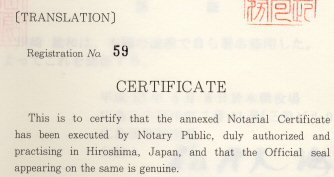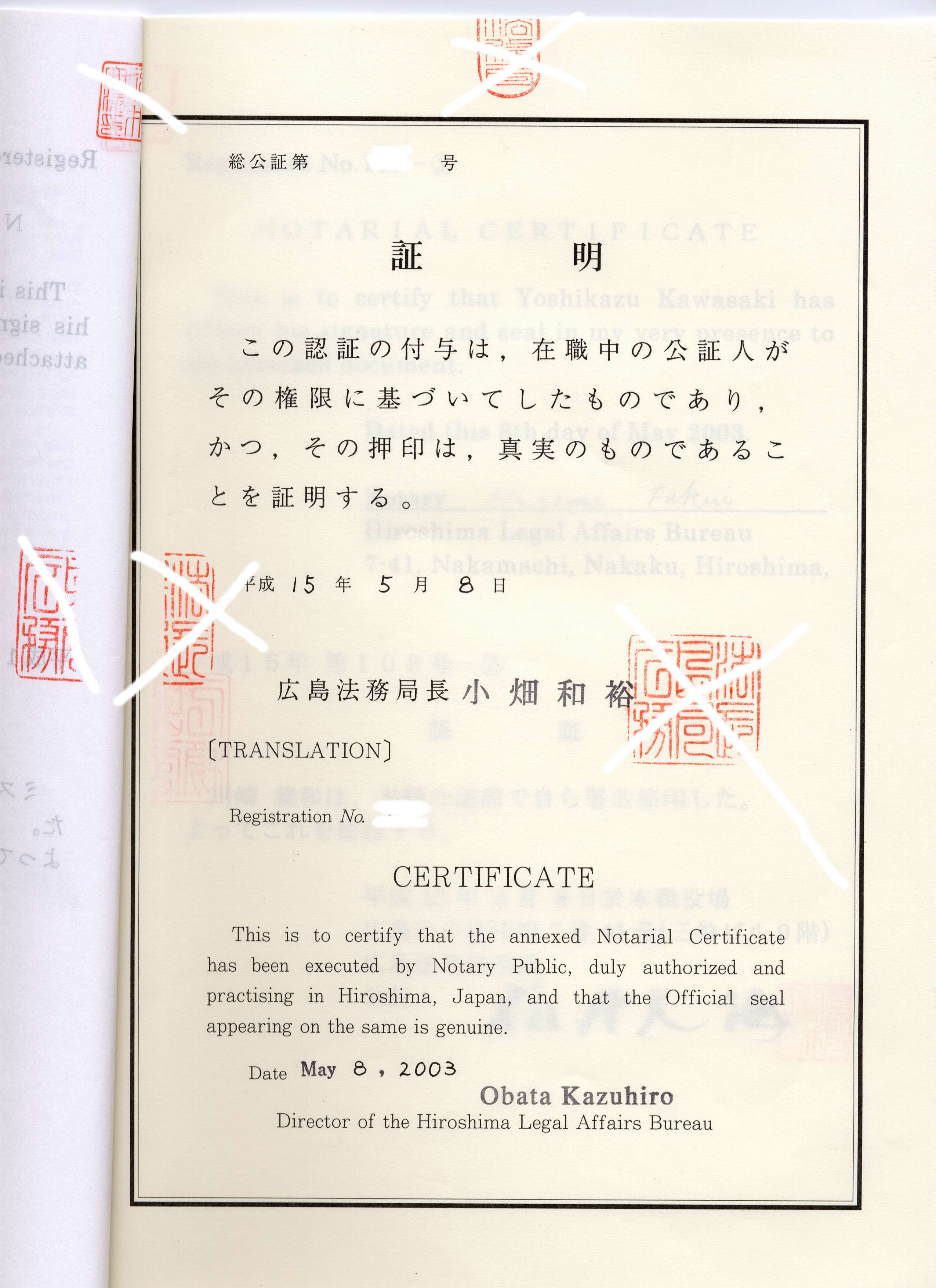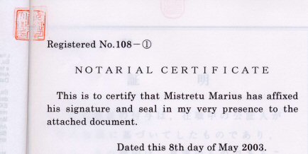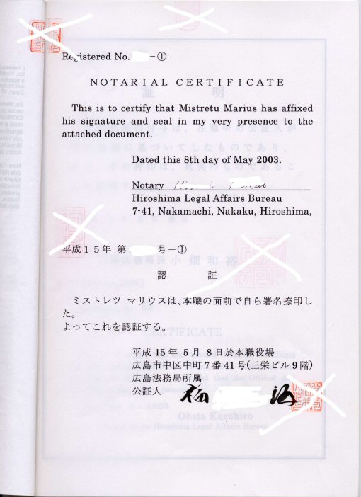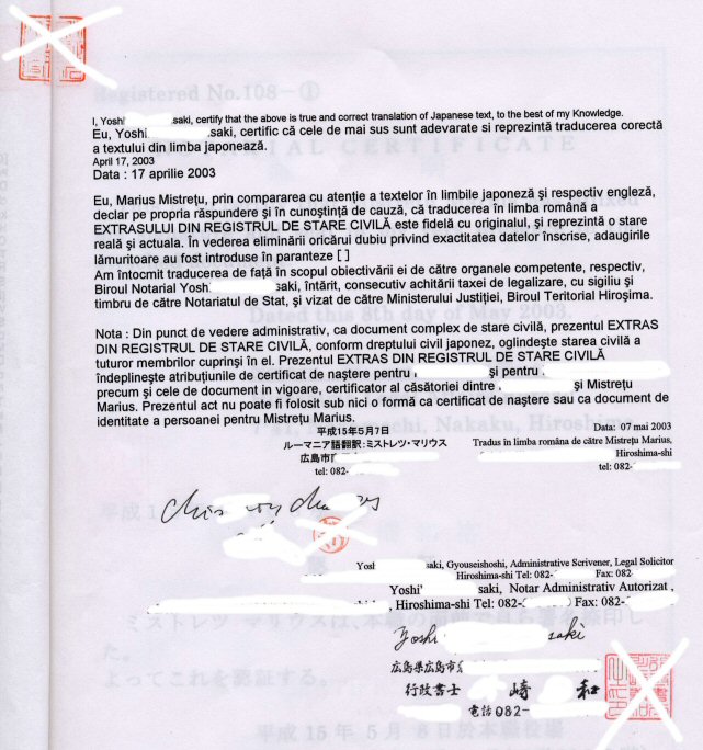 Acum 7 ani, alături de alte acte şi procuri speciale, am încercat să-mi exercit dreptul – zic eu – cetăţenesc de a transcrie în România un act administrativ emis de statul japonez. Un extras din registrul de stare civilă. L-am tradus în engleză şi în română, iar scribul şi-a aplicat ştampila. Am mers apoi amîndoi la notariatul public (singurul din oraş) şi, am legalizat fiecare pagină. După atîta supralegalizare, am recurs şi la supralegalizarea supremă. Certificarea din partea Biroului Teritorial al Ministerului Justiţiei. (aduc comentarii sub fiecare imagine)