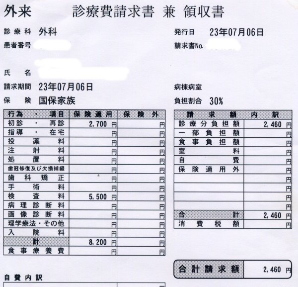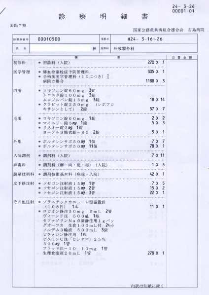 Avem cinci chitanţe: două din 6 şi 26 iulie (8.200+13.980yen) două din 19 şi 24 august (406.160+1140yen) şi una din 22 septembrie (4190yen). În total, costul nominal a fost de 433.670yen, din care am plătit din buzunar: 130.100yen, reprezentînd coplata curată (fără serviciile neacoperite de asigurări). Cu alte cuvinte, sistemul public de sănătate mi-a acoperit 303.570yen, echivalentul a 2 ani de cotizaţie. Reţinem 2 ani.