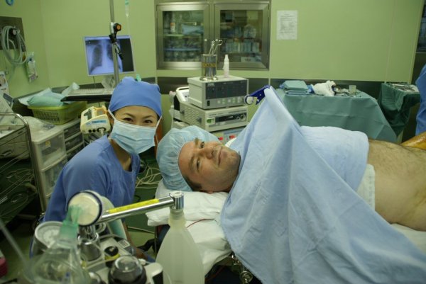Sunt aşezat pe masa de operaţie. În jur, toată lumea se mişca rapid, cu gesturi experte, într-un optimism uşor contrafăcut, dar antrenant. Îmi dispare orice teamă. În 5 secunde sunt gol puşcă sub cearşaf. Sunt răsturnat în poziţia fetală. Mi se înfige acul. După mai puţin de 2 minute îmi mai rămăsese numai jumătatea superioară vie. De la brîu în jos, alt hoit.