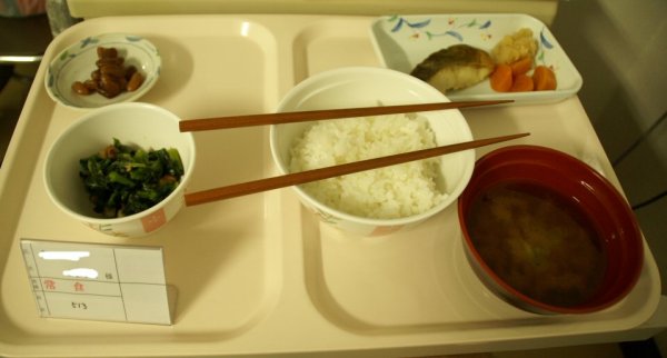 Traducere parţial liberă: Aţi ales meniul standard. În spitalul nostru, starea dumneavoastră de nutriţie este planificată şi monitorizată pe parcursul perioadei de internare. Pe verso aveţi formularul cu care puteţi solicita schimbarea meniului. Semnează: Compartimentul de nutriţie al spitalului Takanobashi.
