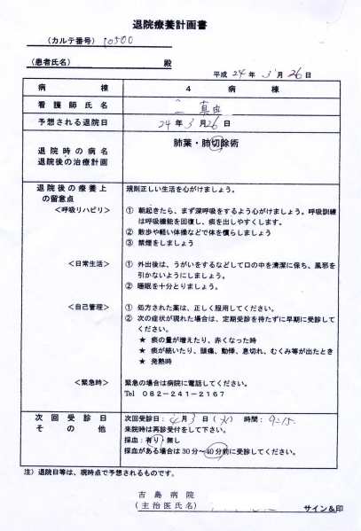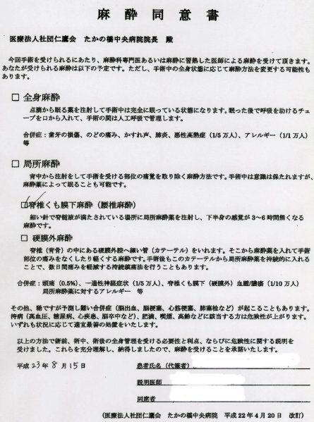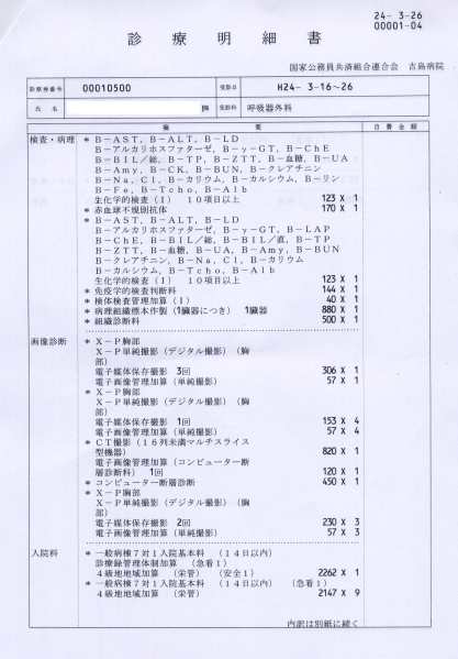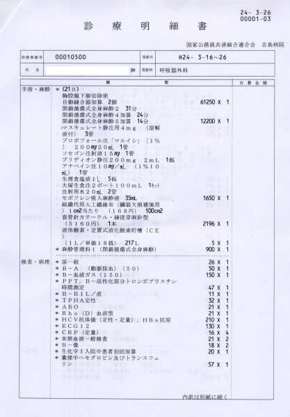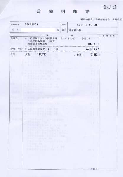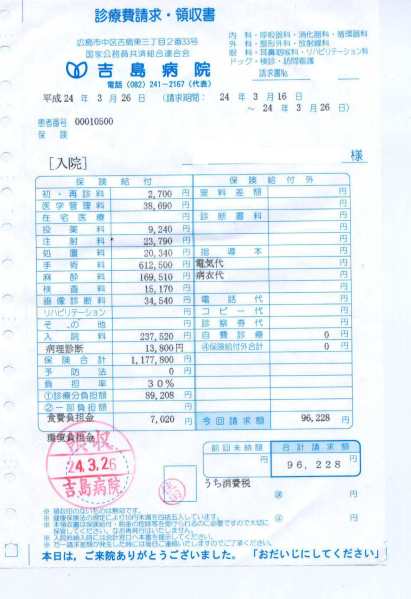 Acuma, gravitatea intervenţiilor chirurgicale are teoretic patru clase de compensare: x5, x10, x20 şi x40, raportate la ziua de spitalizare. Operaţiile mele au fost considerate de gravitatea x10, ceea ce înseamnă 21.000×10=210.000yen. Plus 21.000 (partea de spitalizare) iese totalul de 231.000yen.