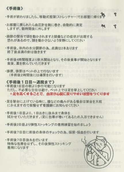 Mai jos este prezentat calendarul internării: investigaţii, regimul alimentar, perfuzii, aerosoli mucolitici, ciorapi compresori şi aparate de masaj pneumatic al picioarelor (pentru prevenirea formării cheagurilor), interdicţia de îmbăiere, sonde urinare, conduita în pat, medicaţie, instructaje (despre ce? şi cînd?).