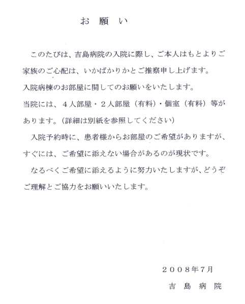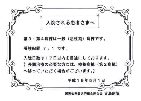 Un fluturaş de prezentare sumară a condiţiilor de îngrijire. Norma de îngrijire în pavilioanele 3 şi 4 (general şi urgenţe) este de 7 pacienţi la o asistentă. Pacientul este anunţat că, în cazul în care internarea va depăşi 17 zile, e posibil să fie mutat într-un alt pavilion.