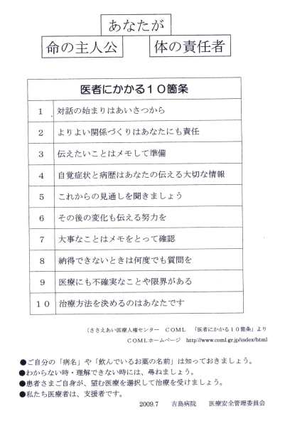 Comisia de administrarea siguranţei din spitalul Yoshijima a decis în iulie 2009 un set de 10 îndatoriri pe care medicul şi pacientul trebuie să le îndeplinească: 1. începe dialogul cu formula de salut, 2. pacientul are datoria să stabilească relaţii amiabile cu ceilalţi, 3. cînd ai ceva de comunicat, notează undeva să nu uiţi, 4. anamneza şi simptomele sunt informaţii de cea mai mare importanţă, 5. întreabă care sunt perspectivele, 6. fă efortul să comunici transformările de după, 7. ce e important, notează pe hîrtie, 8. întreabă ori-de-cîte-ori, pînă cînd vei fi mulţumit de răspuns, 9. certitudinea rezultatului tratamentului are şi limite, 10. tu alegi soluţia terapeutică.