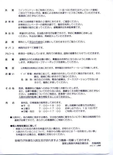 Duminică, 14 august îmi luai traista-n băţ şi intrai pe uşa lăturalnică a spitalului Takanobashi. De ce lăturalnică? Pentru că spitalul nu este deschis duminica decît pentru vizite, dar face internări planificate. La ora 21, toate uşile de la intrare (frontale şi lăturalnice) se încuie.