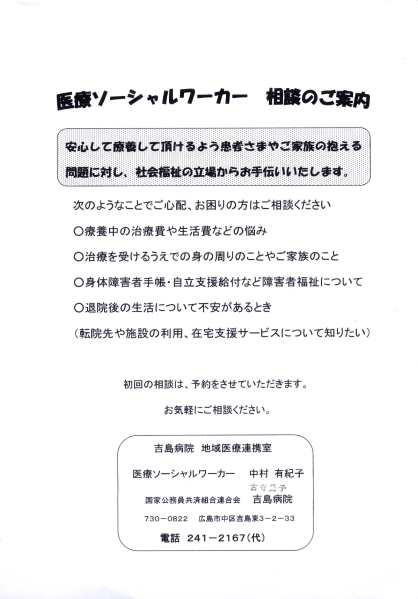 Fluturaşul prin care pacientul este anunţat că, dacă are temeri în legătură cu: costul tratamentului, cu traiul familial, cu invaliditatea, cu traiul de după externare, poate lua legătura cu camera de serviciu social teritorial (nume, adresă, număr de telefon)