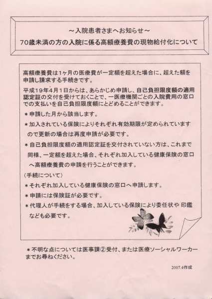 Am văzut cu alte ocazii care sunt valorile şi principiile ce guvernează sistemul de sănătate japonez. Am arătat cum se aplică coplata şi care sunt limitele ei. Uneori, o internare poate costa cu mult peste cît este în stare pacientul să achite într-un termen rezonabil, chiar dacă are o asigurare socială (cu 20% coplată) sau populară (30% coplată).
